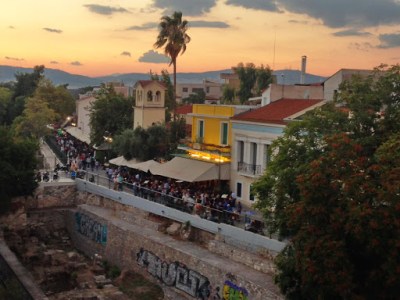 In the area you will see many cafes and bars usually filled with tourists. Athenians mostly enjoy a long night walk at the wide pedestrian with an amazing view to the Acropolis